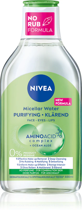 NIVEA Purifying Micellar Water este o apă de curățare 3 în 1 cu particule micelare active, care îndepărtează eficient machiajul, excesul de sebum și impuritățile, lăsând pielea curată, reîmprospătată și echilibrată.