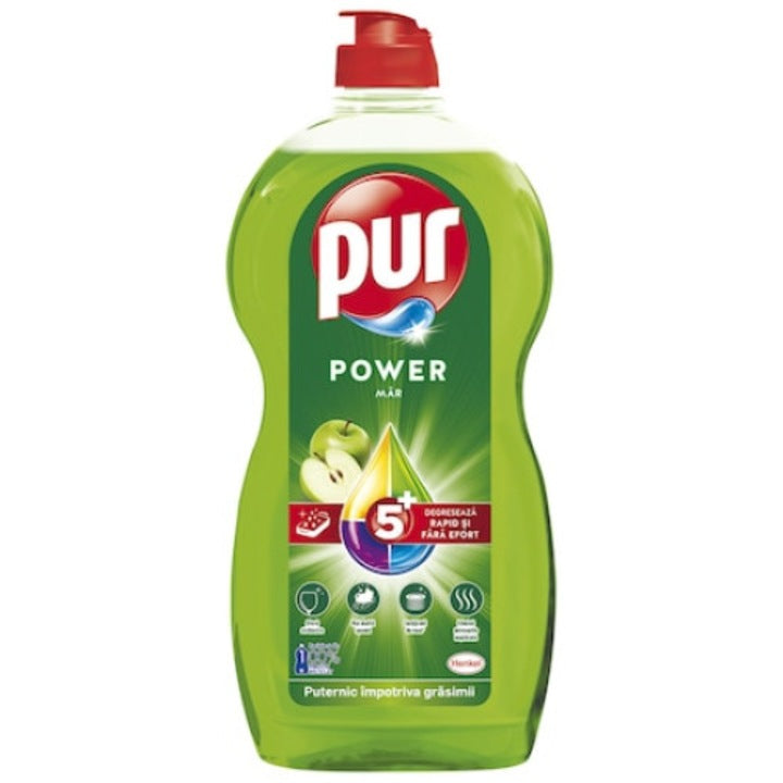 Pur Power Apple este un detergent lichid de vase cu acțiune intensă împotriva grăsimilor și murdăriei persistente, chiar și în apă rece. Datorită noii formule concentrate, oferă o spumă bogată și de lungă durată, lăsând vasele curate, strălucitoare și fără mirosuri neplăcute.