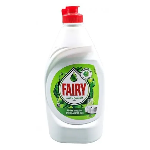 Fairy Apple este un detergent lichid de vase cu putere de curățare excepțională, recunoscut pentru eficiența sa împotriva grăsimii chiar și în apă rece. Formula concentrată curăță în profunzime vasele, farfuriile, tigăile și oalele, lăsându-le strălucitor de curate cu un parfum proaspăt de măr verde.