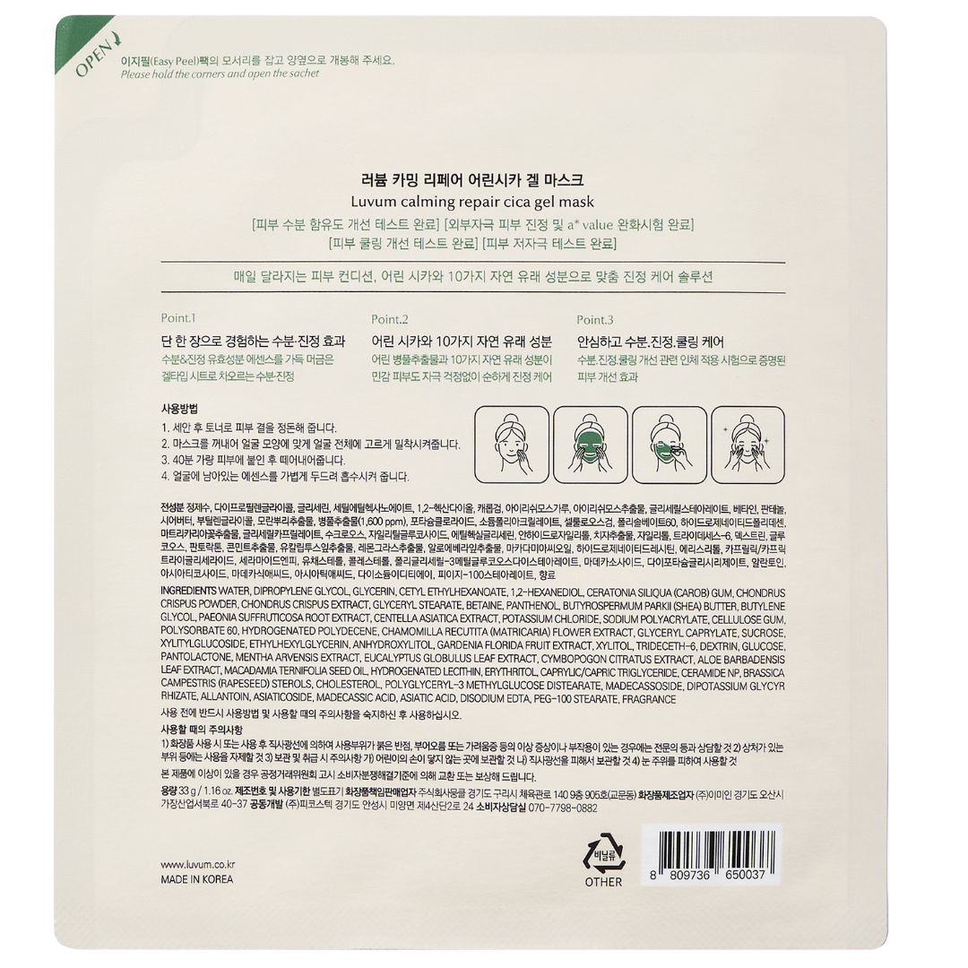 Descoperă Luvum Masca Gel pentru fata Calming Repair Cica, un set de 5 măști faciale concepute pentru a calma și repara pielea sensibilă și iritată. Îmbogățită cu Centella Asiatica, cunoscută și sub denumirea de Cica, această mască ajută la reducerea roșeții și inflamației, oferind pielii o senzație de confort și prospețime. Formula sa de gel hidratează și revitalizează pielea, lăsând-o moale și suplă după fiecare utilizare.