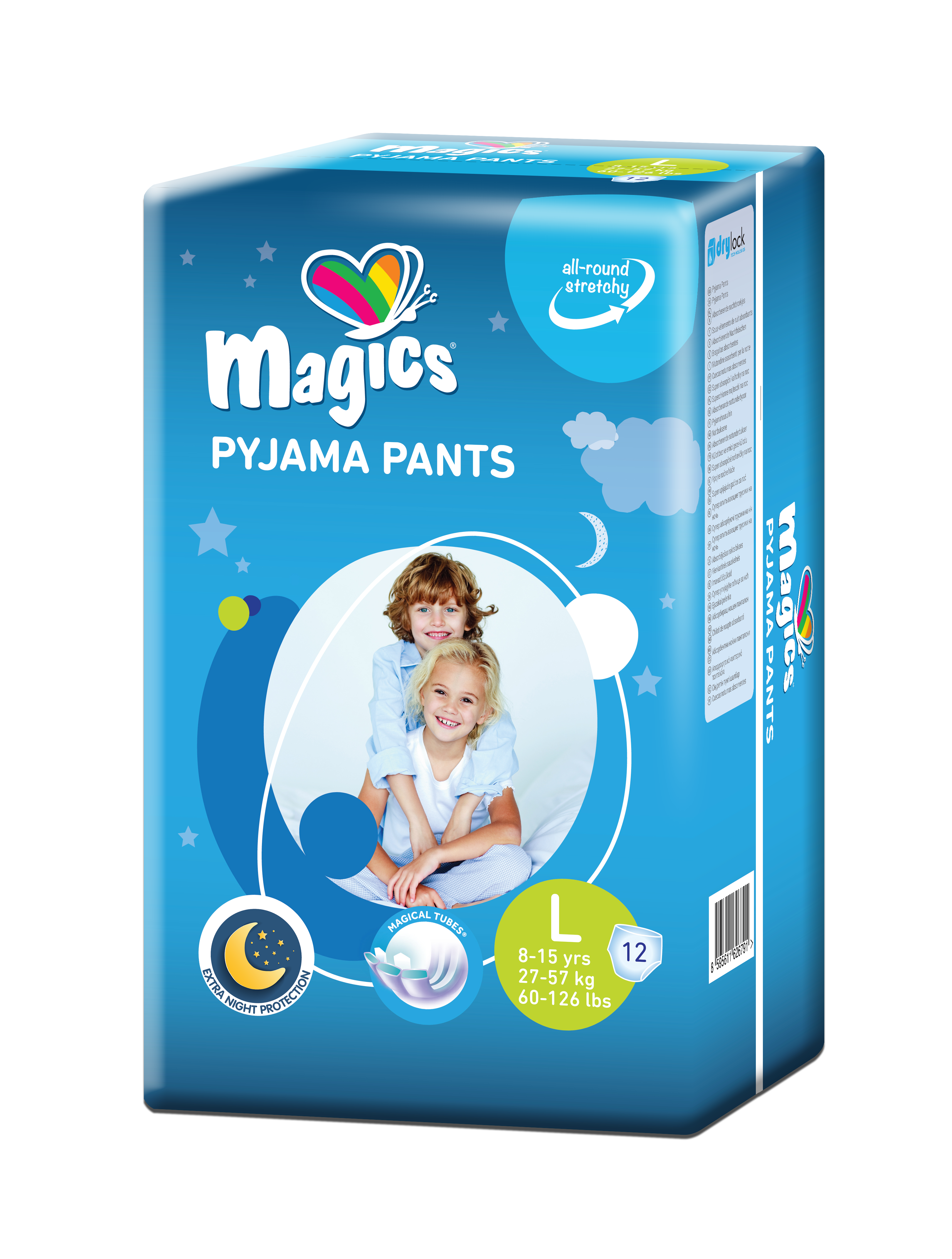 MAGICS PYJAMA Pants Night L sunt scutece de înaltă calitate, concepute special pentru a asigura un somn confortabil și fără griji pentru copiii cu greutate cuprinsă între 27 și 57 de kilograme. Aceste scutece sunt proiectate pentru a oferi o protecție de lungă durată pe timpul nopții, astfel încât copilul dumneavoastră să se trezească dimineața fără a fi deranjat de scurgeri neplăcute.