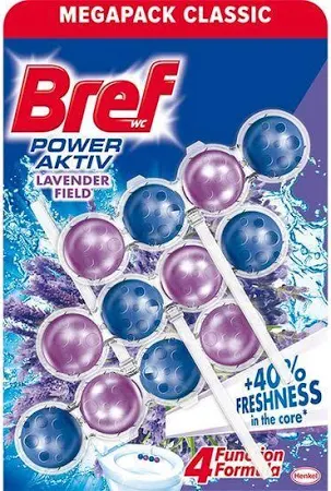Bref Power Aktiv Lavandă este soluția practică și eficientă pentru o toaletă mereu curată și parfumată. Datorită formulei sale unice cu 4 beneficii funcționale, asigură igienă și prospețime de la primul până la ultimul jet de apă.