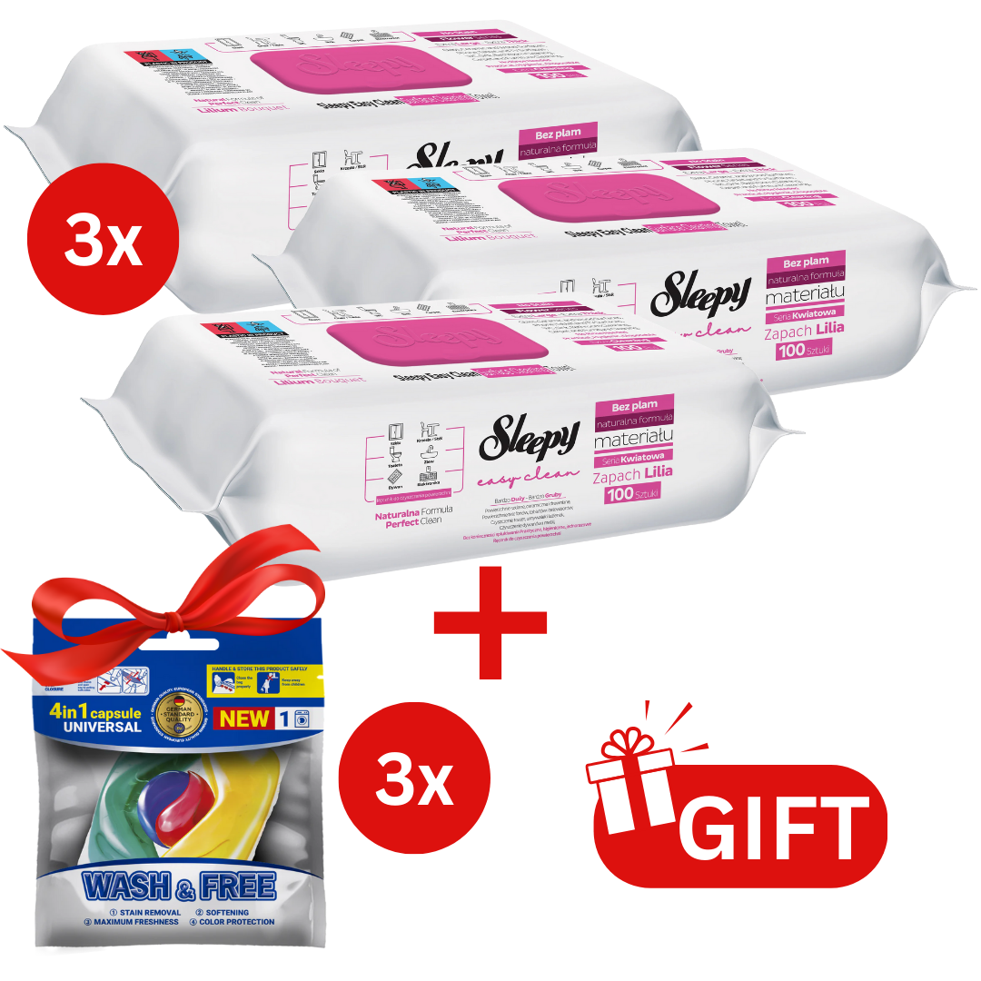 PACHET PROMO: 3× Șervețele Sleepy Lilium Bouquet 100 buc + 3× Capsule rufe Wash & Free 4in1