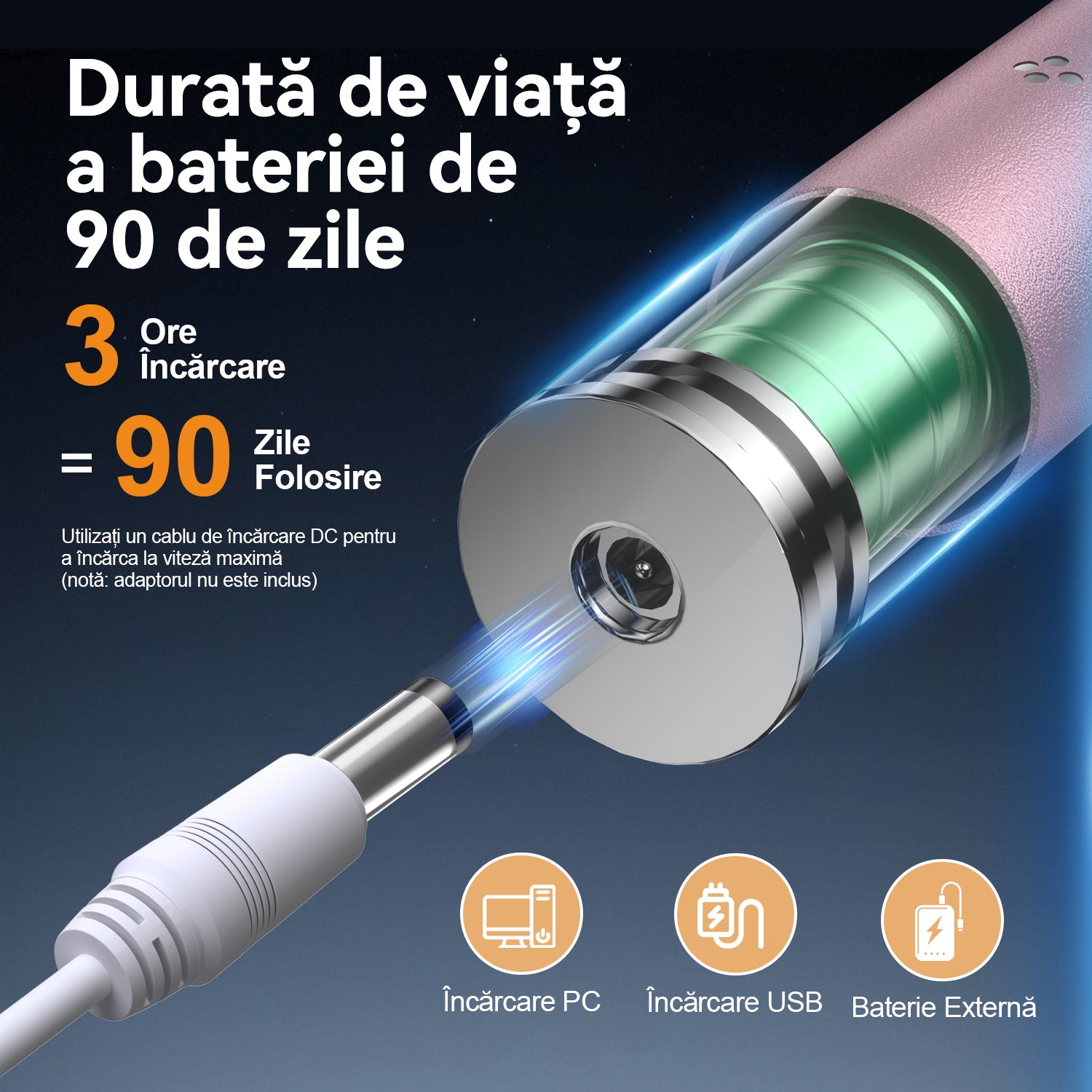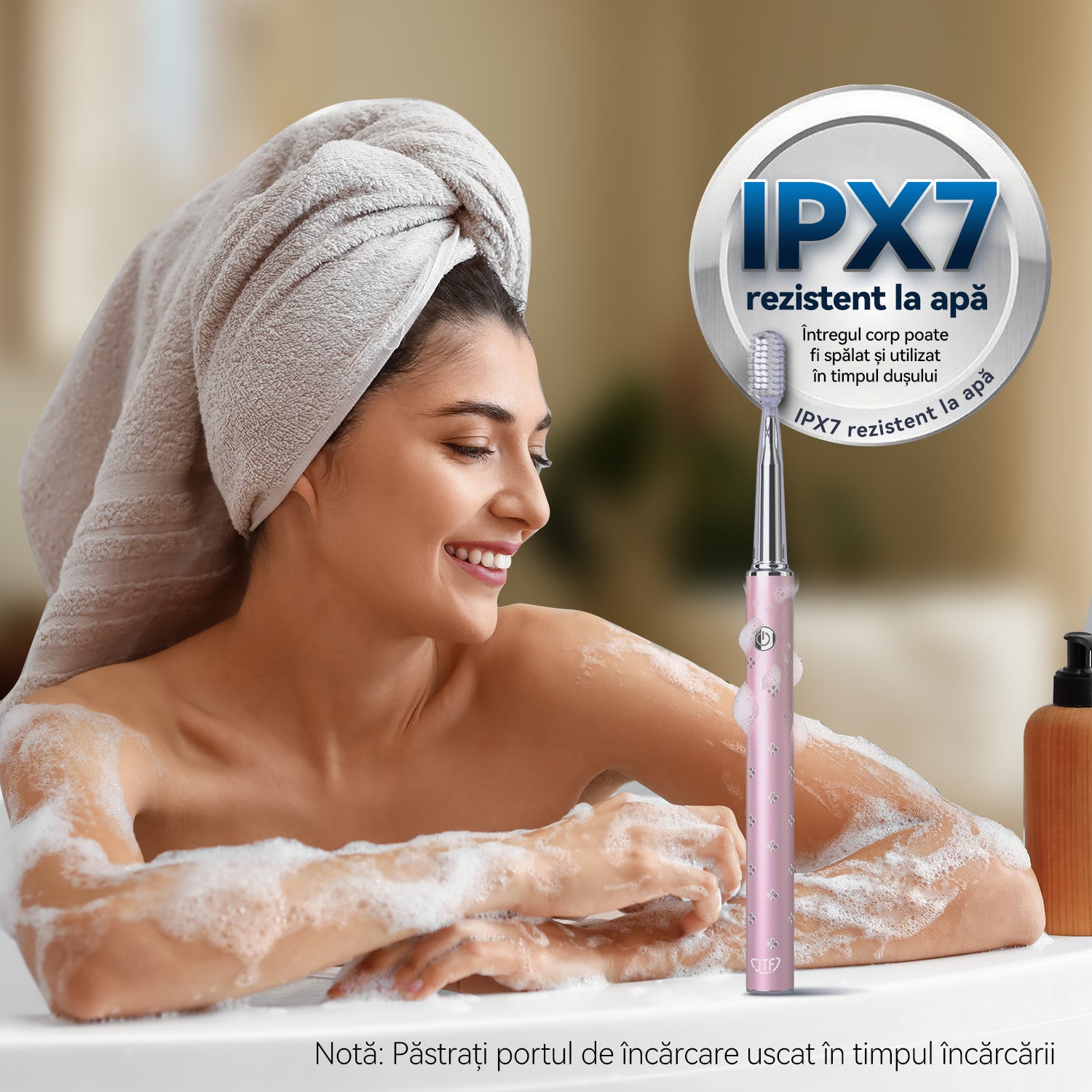 Poate fi utilizată fără probleme în timpul dușului – întregul corp al periuței este lavabil. (Notă: menține portul de încărcare uscat în timpul alimentării)