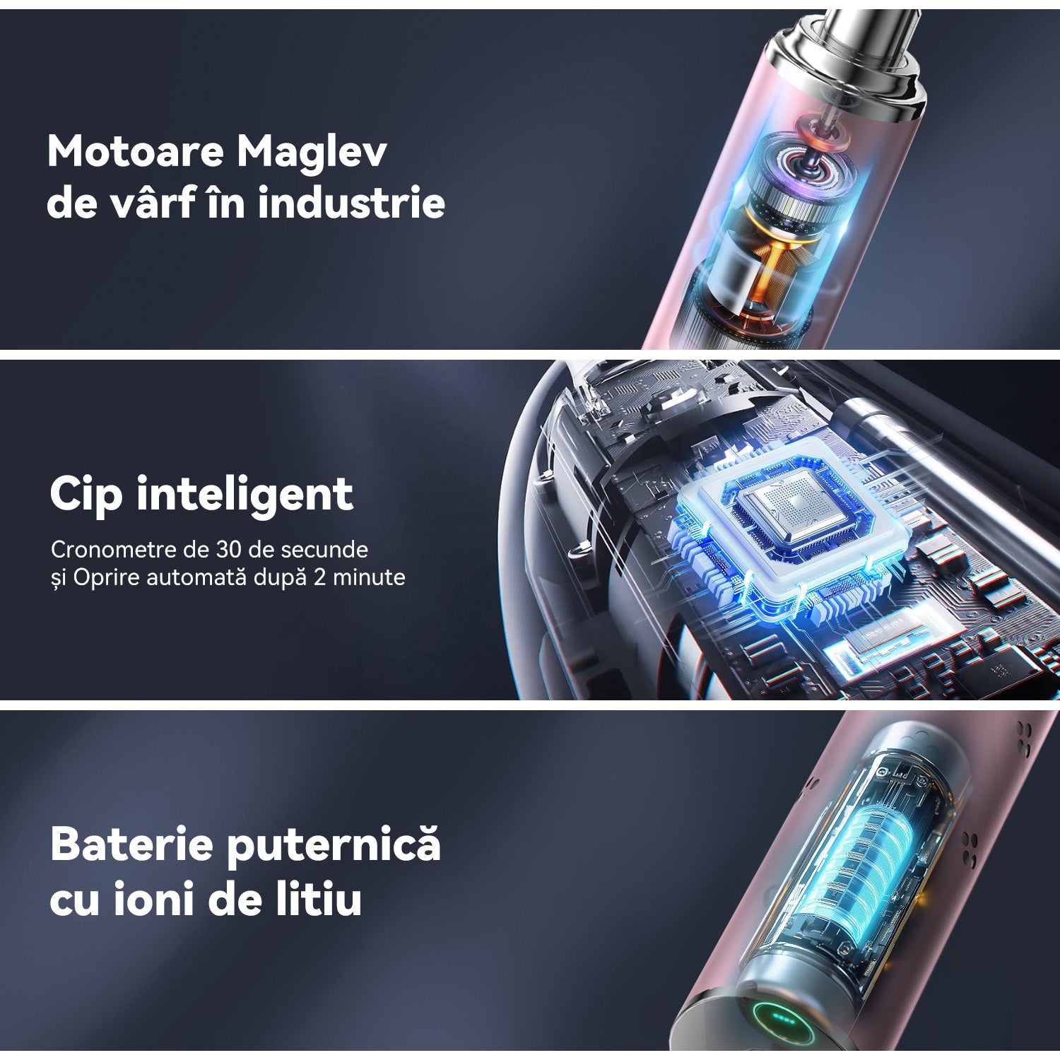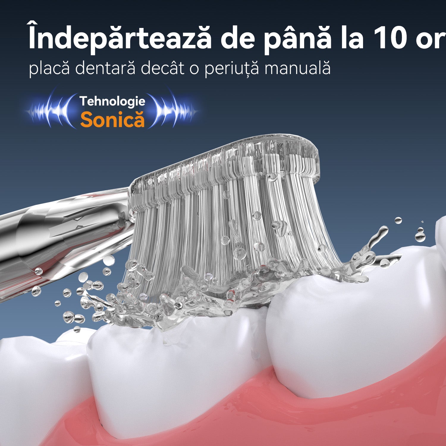 Îndepărtează de până la 10 ori mai multă placă bacteriană comparativ cu o periuță manuală, ajungând chiar și în zonele greu accesibile.