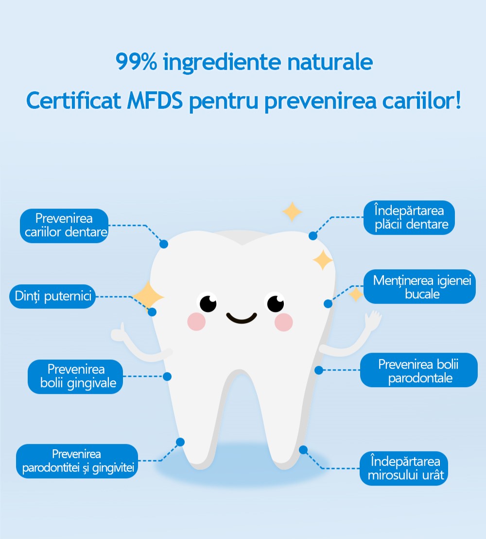 Descoperă Pyunkang Yul Bebe Toothpaste (Blueberry), o pastă de dinți sigură și delicată, formulată special pentru copii. Aceasta nu conține 14 tipuri de ingrediente nocive, inclusiv conservanți și ingrediente de origine animală. Cu un conținut redus de fluorură, xilitol și propolis, pasta de dinți ajută la prevenirea cariilor și menținerea sănătății dentare a copiilor. Aroma de afine face periajul dinților o experiență plăcută și atrăgătoare, încurajând copiii să-și mențină igiena orală.